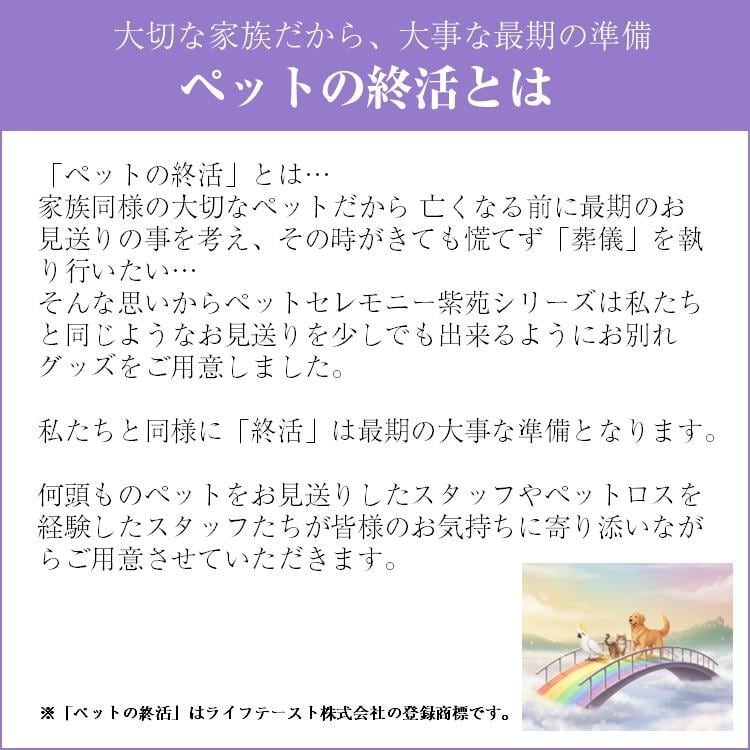 そんな思いからペットセレモニー紫苑シリーズは私たち人間と同じようなお見送りが少しでも出来るようにお別れグッズをご用意しております。
