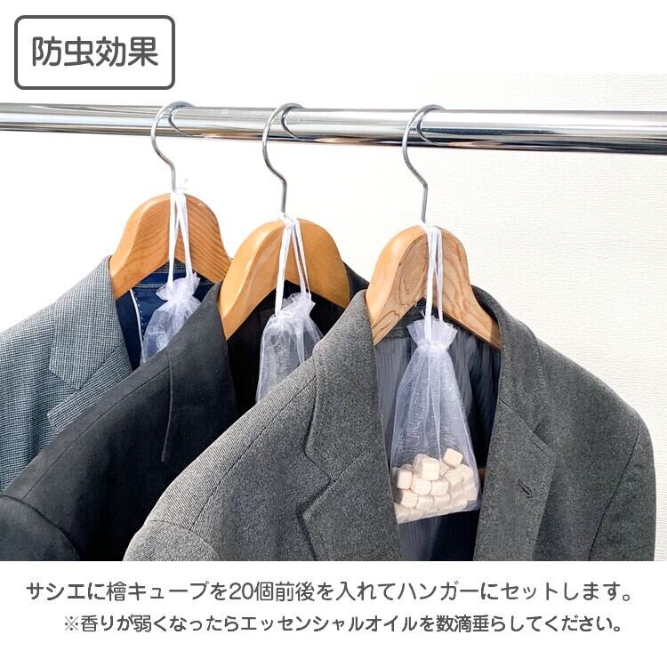 檜には有害な微生物や昆虫の活動を抑制するフィトンチッドというを成分を多く含んでいます。サシエに入れてクロゼットやタンスで防虫材としても使用できます。