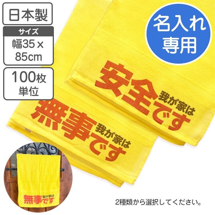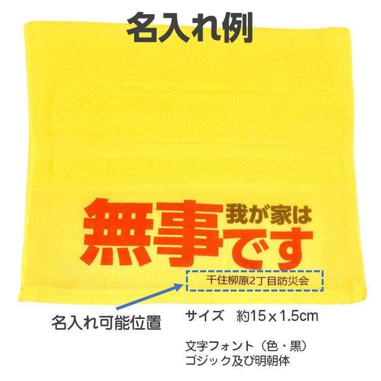 タオルは濃い黄色にこだわり、色指定をして大阪・泉州のタオル工場で染め織り込んだ防災用安否確認タオルとして人気のあるカラーです。