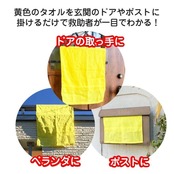 この1本の黄色いタオルをドアや門に巻くだけで災害時に救助者が一目で安否確認ができ、救助活動にとって大きな役割を果たします。