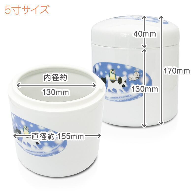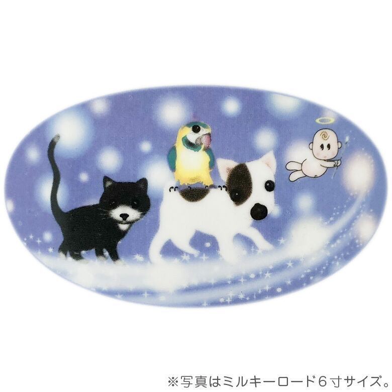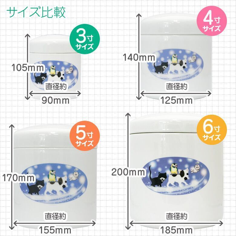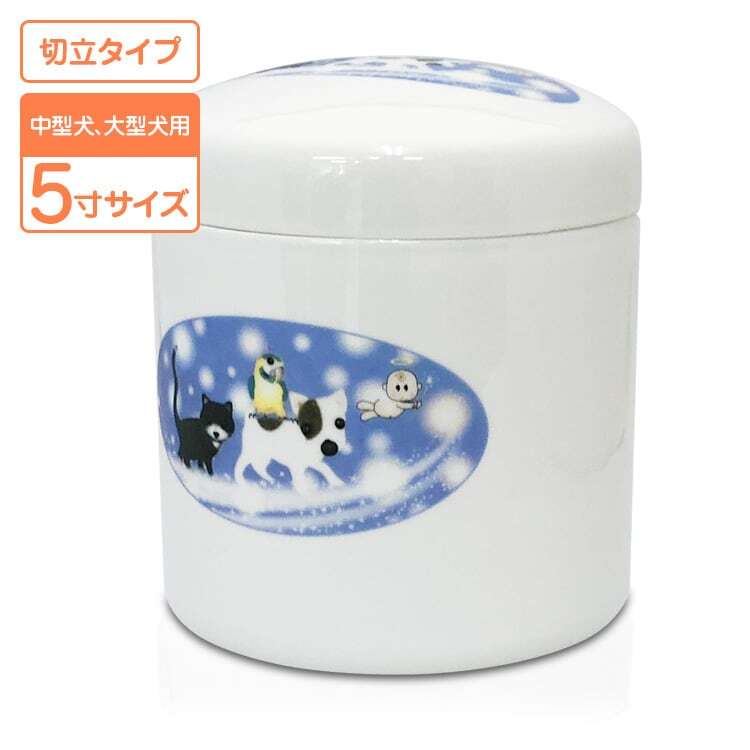 ペットが天に召されていく様子を描いた明るい雰囲気のイラストは、可愛い骨壺を用意してあげたい方にオスススです。